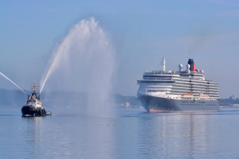 Begleitet von Wasserfontänen läuft die Queen Victoria erstmals in Kiel ein (Bild Frank Behling)