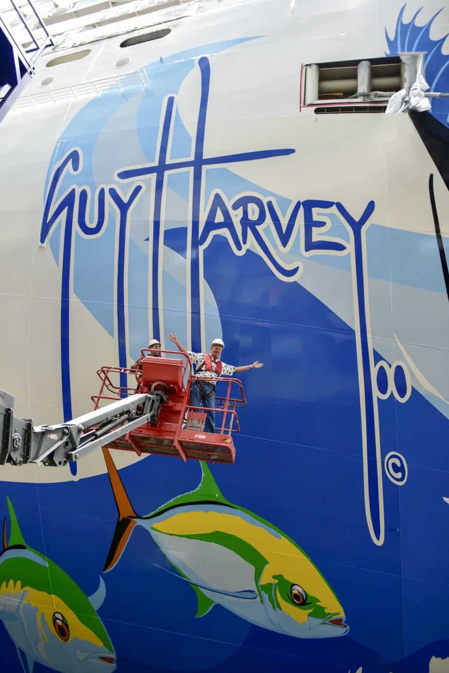 Meerestierkünstler und Naturschützer Guy Harvey war in dieser Woche zu Besuch in der Papenburger Meyer Werft, um das bisher größte Kunstwerk seiner Karriere erstmals in Augenschein zu nehmen: die Schiffsbemalung der Norwegian Escape, dem bisher größten Schiff der US-amerikanischen Reederei Norwegian Cruise Line, das am 23. Oktober 2015 Weltpremiere in Hamburg feiert. Das Motiv, das den über 300 Meter langen Rumpf des Freestyle Cruising® Resorts ziert, zeigt Harveys Perspektive der spektakulären Unterwasserwelt der Karibik inklusive dem für Harvey typischen Fächerfisch sowie Stachelrochen, Meeresschildkröten, Walhaien und eine Vielzahl tropischer Fische.