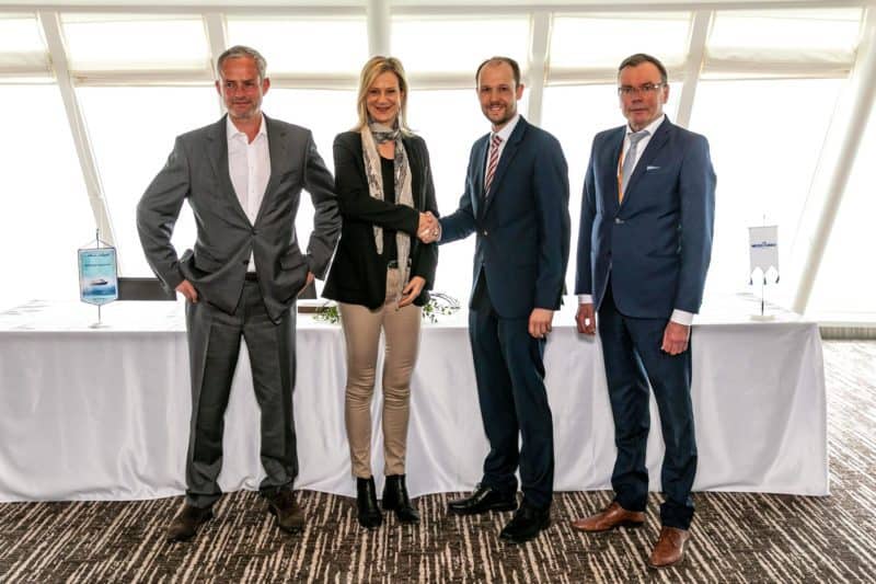 Bei der Übergabe der neuen Mein Schiff 1: Frank Kuhlmann, Wybcke Meier CFO und CEO von TUI Cruises, Dr. Jan Meyer, Geschäftsführer der Meyer Werft Turku und Tapani Pulli, Deputy CEO Meyer Turku (v.l.n.r.)