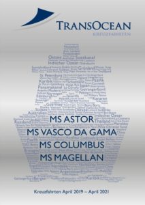 Der neue Katalog von TransOcean Kreuzfahrten für die Saison 2019 bis 2021 ist ab sofort in allen guten Reisebüro erhältlich. Auf 318 Seiten werden die aktuelle Flotte sowie die zahlreichen Routen-Highlights präsentiert. Der neue Katalog beinhaltet insgesamt 110 Kreuzfahrten von April 2019 bis April 2021 mit der neuen Vasco da Gama sowie der Astor. Auch die internationalen Kreuzfahrten auf den englischsprachigen Schiffen Columbus und Magellan sind wieder Bestandteil der Angebotspalette. Reisen von zwei bis 128 Tagen bieten vielfältige Auswahl – von der Schnupper-Kreuzfahrt bis zur großen Weltreise.