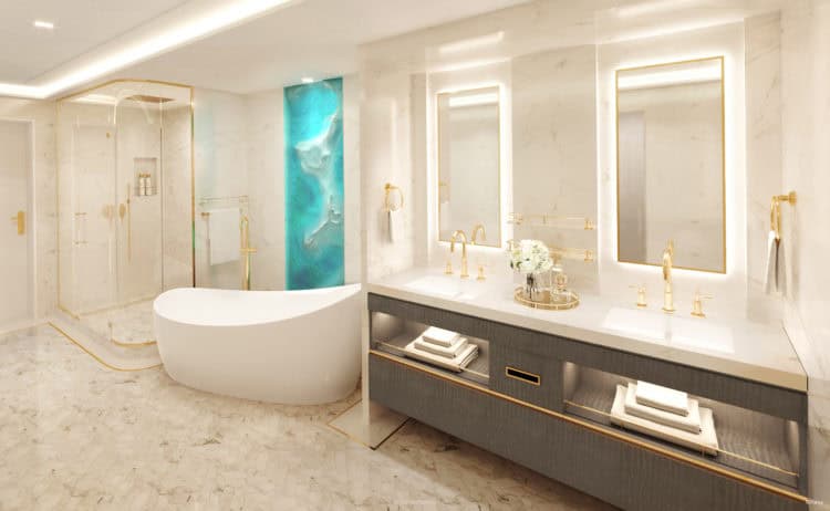 Die Wish Tower Suite verfügt über zwei Hauptschlafzimmer, ein Kinderzimmer, eine Bibliothek, die in ein Schlafzimmer umgewandelt werden kann, und viereinhalb Badezimmer und bietet damit Platz für bis zu acht Gäste. Das geräumige Wohnzimmer wird von einem offenen Essbereich, einer großen Vorratskammer und einer Bar flankiert, die alle durch eine ausgedehnte zweistöckige Fensterwand einen Blick über die oberen Decks bis zum Horizont bieten.