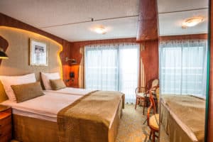 Alle Kabinen (ca. 14 Quadratmeter) und Minisuiten (ca. 16 Quadratmeter) liegen aussen, sind stilvoll, komfortabel und luxuriös eingerichtet. Auf dem Mittel- und Oberdeck mit französischem Balkon, auf dem Hauptdeck sind die kleineren Fenster aus Sicherheitsgründen nicht zu öffnen. Alle Kabinen sind mit Dusche/WC, TV, Radio, Minibar, Safe, Föhn und individuell regulierbarer Klimaanlage ausgestattet.